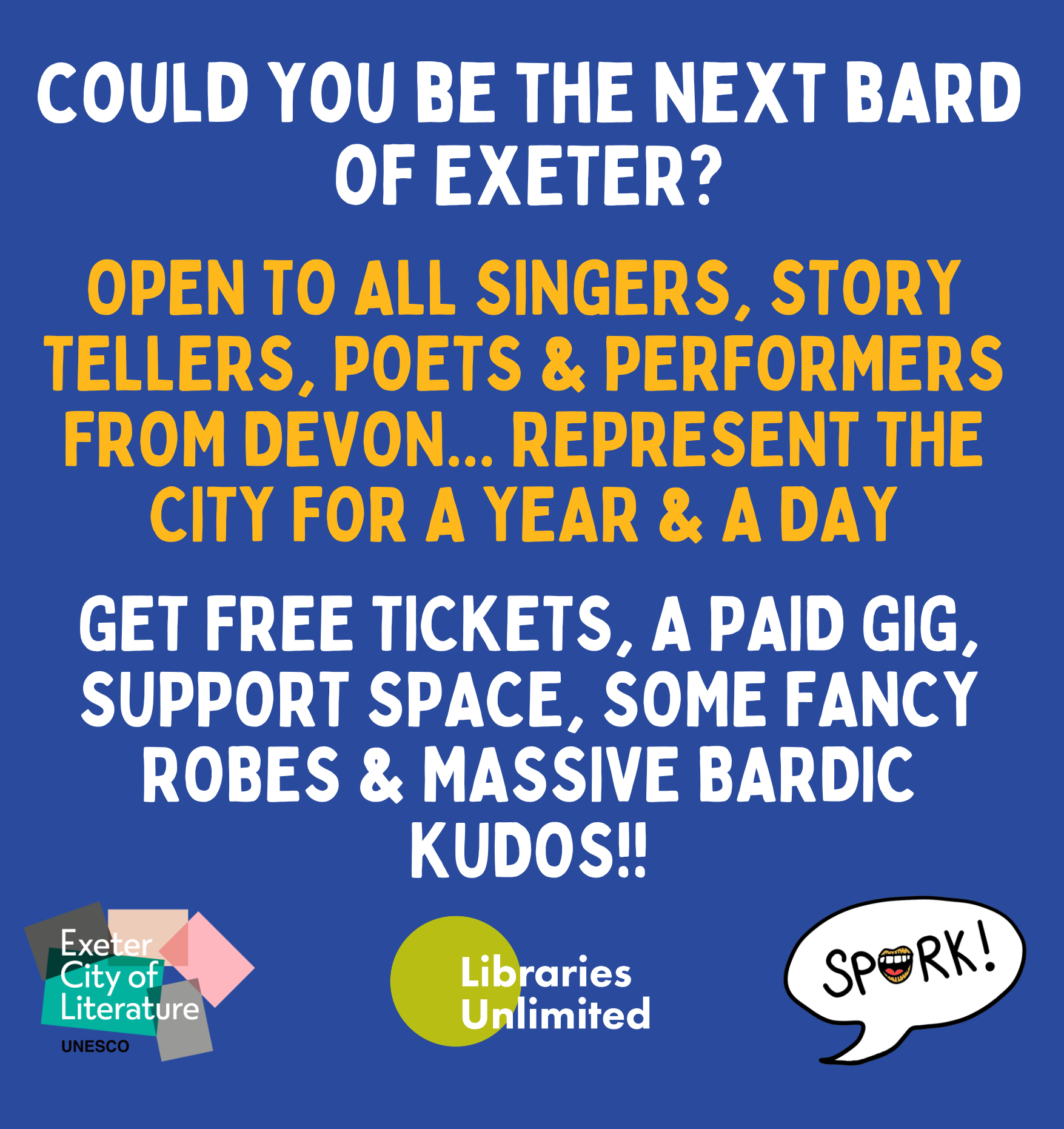 Supported by Exeter Library, Exeter UNESCO City of Literature, Taking the Mic and Spork! Poetry. The Bardic role is a chance for you to make your mark on the city!