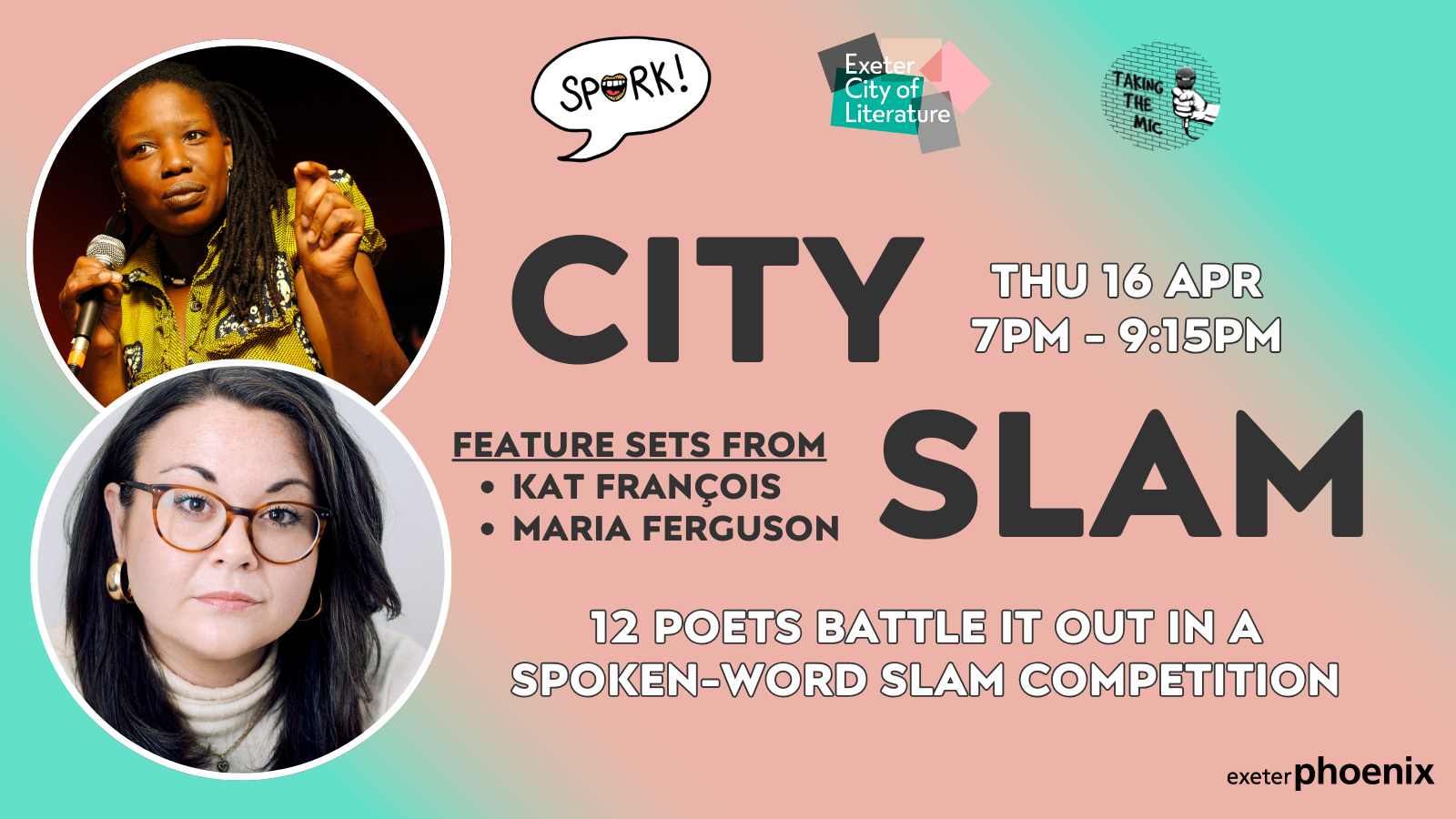 Exeter UNESCO City of Literature, Spork! Poetry and Taking the Mic present the 4th annual City Slam; an exciting competition to find the best spoken-word artist in Exeter (and across Devon).